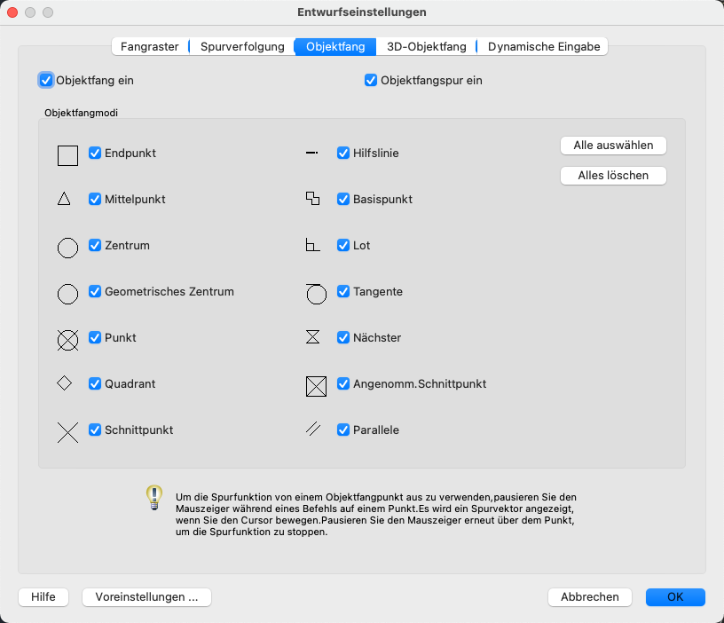 Steuert die aktuellen Einstellungen für den Objektfang.