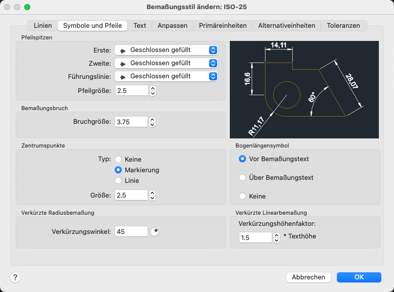 Legt das Format und die Position für Pfeilspitzen, Zentrumspunkte, Bogenlängensymbole und verkürzte Radiusbemaßungen fest.