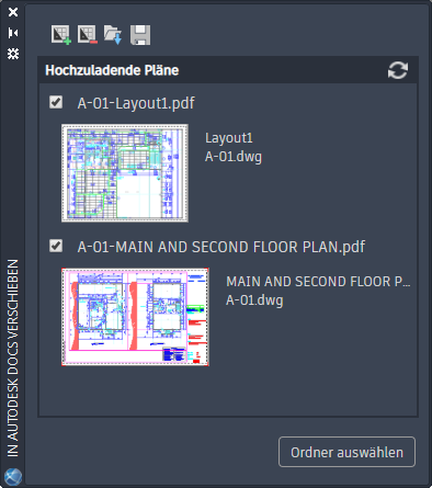 Arbeiten Sie auf der Baustelle mit anderen zusammen, indem Sie Ihre Zeichnungslayouts als PDF-Dateien an Autodesk Docs übertragen. Wählen Sie Layouts aus mehreren Zeichnungen aus, und laden Sie sie als PDFs in einen ausgewählten Projektordner in Autodesk Docs hoch.
