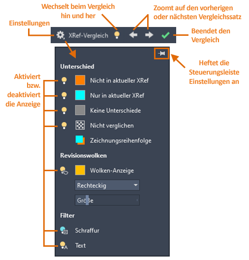 Ähnlich wie bei der Funktion zum Zeichnungsvergleich können Sie jetzt die Änderungen vergleichen, die an einer Zeichnungsdatei vorgenommen wurden, die der aktuellen Zeichnung als externe Referenz (XRef) zugeordnet ist.