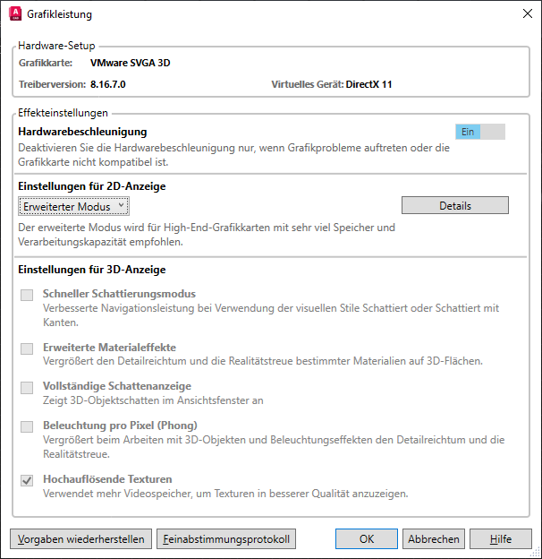 - Zeigt Informationen zur Grafikhardware an, wie Grafikkarte, Treiberversion und aktuelles virtuelles Gerät.