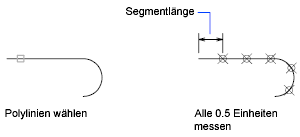 Die Abbildung zeigt, wie der Befehl MESSEN Abstände von 0.5 Einheiten entlang einer Polylinie markiert. Die Systemvariable PDMODE ist auf 35 festgelegt.