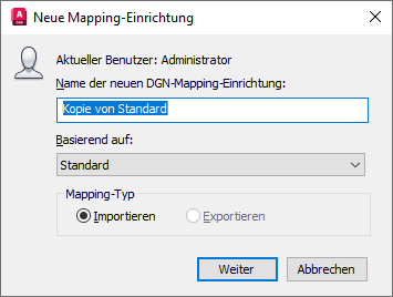 Richtet das Mapping für den Import und Export von DGN-Dateien ein.