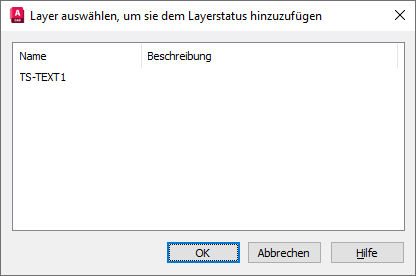 Zeigt den Namen und die Beschreibung der Layer an, die dem Layerstatus nicht hinzugefügt wurden. Wählen Sie den hinzuzufügenden Layer, und klicken Sie auf OK.