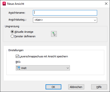 Speichert eine neue benannte Ansicht aus der Anzeige im aktuellen Ansichtsfenster oder durch Definition eines rechteckigen Fensters.