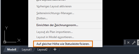 Klicken Sie mit der rechten Maustaste auf die Registerkarte Modell oder Layout, und wählen Sie Oberhalb der Statusleiste fixieren oder Auf gleicher Höhe wie Statusleiste fixieren.