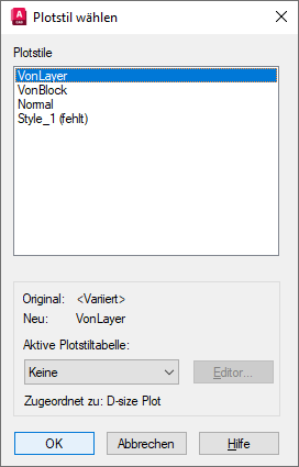 Zeigt die verfügbaren Plotstile an, einschließlich des Standardplotstils NORMAL. Ein Plotstil besteht aus einer Sammlung von Eigenschaften, die beim Plotten angewendet werden.