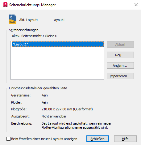 Hier können Sie die aktuelle Seiteneinrichtung anzeigen, eine andere aktuelle Seiteneinrichtung festlegen, neue Seiteneinrichtungen erstellen, vorhandene Seiteneinrichtungen bearbeiten und Seiteneinrichtungen aus anderen Zeichnungen importieren.