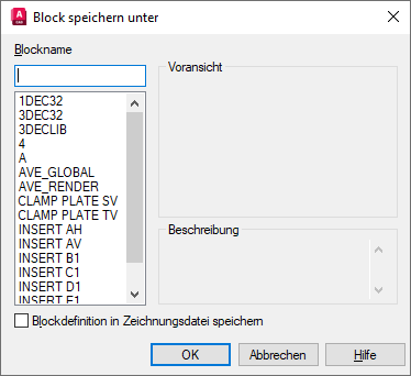 Speichert die Blockdefinition als Zeichnungsdatei. Wenn dazu eine bereits bestehende Zeichnungsdatei ausgewählt wird, wird diese überschrieben. Standardmäßig wird der angegebene Blockname als Name der Zeichnungsdatei verwendet.