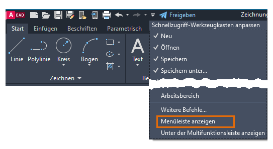 Die Menüleiste kann über die Dropdown-Liste des Schnellzugriffs-Werkzeugkastens oder durch Anpassen der Benutzeroberfläche mit dem Befehl ABI aktiviert werden.