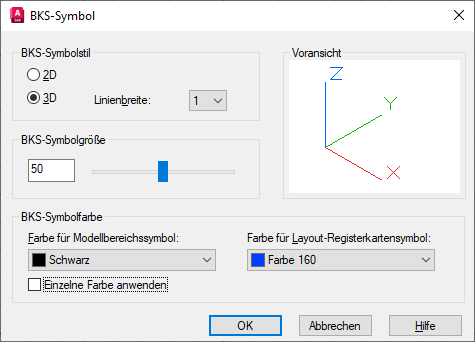Steuert die Farbe des BKS-Symbols im Modellbereichsfenster und auf der Layout-Registerkarte.