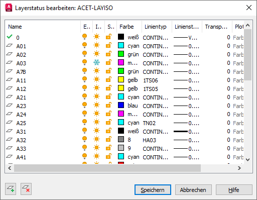 Zeigt eine Liste der Layer des ausgewählten Layerstatus und ihre Eigenschaften an.