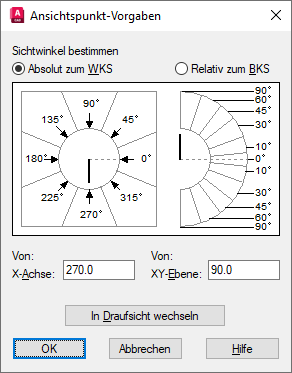 Legt die Ansichtsrichtung relativ zum Weltkoordinatensystem (WKS) oder zu einem Benutzerkoordinatensystem (BKS) fest.