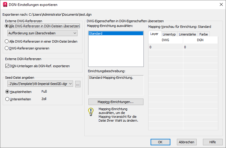 Standard ist die vorgabemäßige Mapping-Einrichtung, die Daten aus der exportierten Zeichnung extrahiert und ein automatisches Mapping für DGN-Layer, Linientypen, Linienstärken und Farben, wie in der Mapping-Voransicht angezeigt, verwendet.