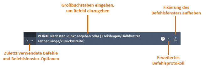 Nachdem Sie einen Befehl eingegeben haben, wird in der Befehlszeile ggf. eine Reihe von Eingabeaufforderungen angezeigt. Nachdem Sie z. B. PLINIE eingeben und dann die erste Eingabeaufforderung festlegen, wird die folgende Eingabeaufforderung angezeigt:
