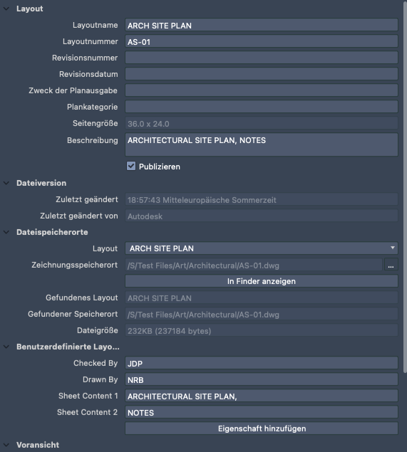 Die Zeichnungsdatei (DWG), die das Layout enthält, wird in der Eigenschaft Zeichnungsspeicherort angegeben.