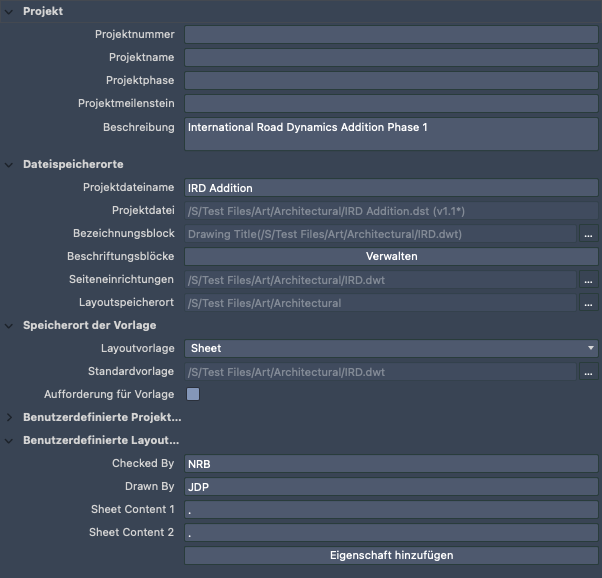 Zeigt die Pfade für das Projekt, die Seiteneinrichtungs-Überschreibungen und die im Projekt verwendeten Beschriftungs- und Bezeichnungsblöcke an