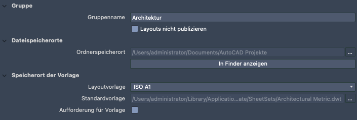 Gibt den Speicherort der Ordner für neue Zeichnungsdateien (DWG) an, die erstellt werden, wenn der Gruppe ein neues Layout hinzugefügt wird.