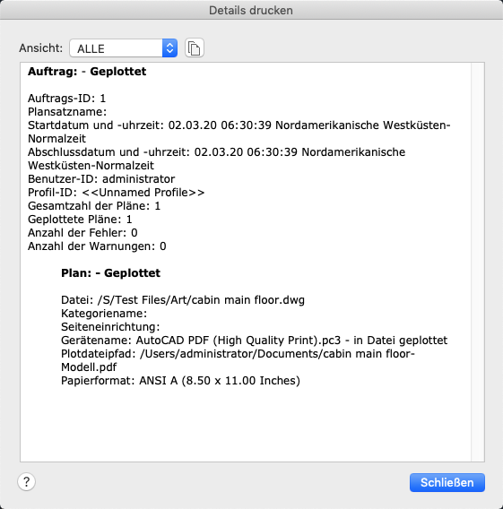 Zeigt Informationen zu Plot- und Publizieraufträgen an, die in der aktuellen Sitzung abgeschlossen wurden.
