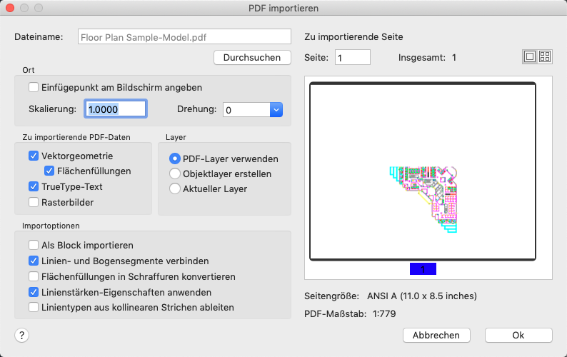Sie können einen anderen Import-Skalierungsfaktor für die importierten Objekte angeben. Beim Importieren einer Seite aus einer PDF-Datei wird nicht die Einstellung der Systemvariable INSUNITS verwendet, da jede Seite eine unterschiedliche Skalierung haben kann.