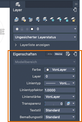 Sie können Eigenschaften wie Farbe und Linientyp einzelnen Objekten oder als den Layern zugewiesene Vorgabeeigenschaften zuweisen.