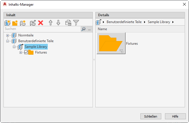Mit dem Befehl AMCONTENTMANAGER wird das Dialogfeld Inhalts-Manager aufgerufen, das viele Werkzeuge zum Erstellen und Verwalten von Inhaltsbibliotheken enthält.