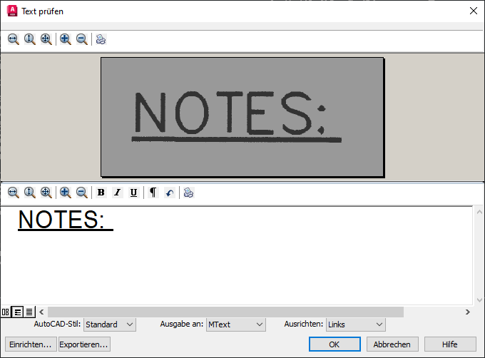 - Klicken Sie auf OK, um das Wort NOTES: als AutoCAD-MText in die Zeichnung einzufügen.