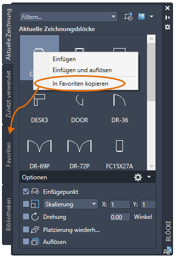 Die erweiterte Palette ermöglicht Ihnen das rasche Einfügen von AutoCAD-Zeichnungsdateien (DWG) als Block in die aktuelle Zeichnung, ohne sie zuvor zur Registerkarte Bibliotheken hinzuzufügen. Die neue Option DWG als Block einfügen () ist auf allen Registerkarten verfügbar.