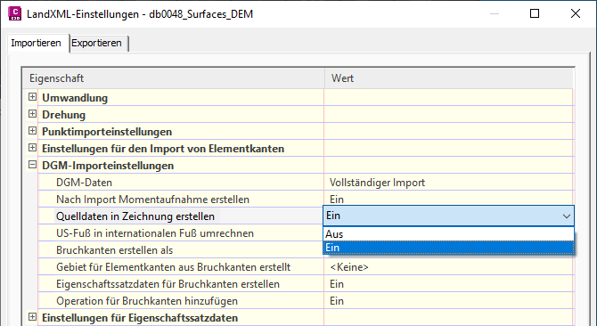 Abbildung 2: LandXML-Einstellungen für den DGM-Import
