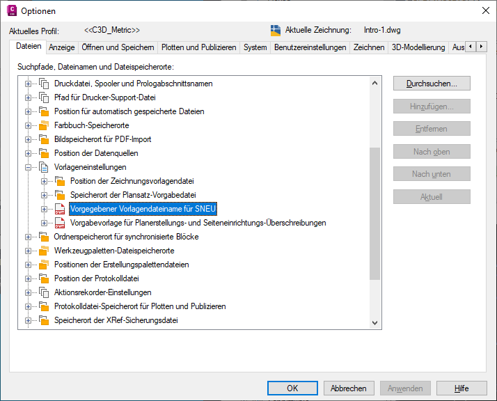 Wenn Sie Autodesk Civil 3D mit dem britischen Profil starten, ist die Standardvorlage für eine neue Zeichnung _Autodesk Civil 3D (Imperial) NCS.dwt. Wenn Sie Autodesk Civil 3D mit dem metrischen Profil starten, ist die Standardvorlage für eine neue Zeichnung _Autodesk Civil 3D (Metric) NCS.dwt. Die Standardvorlage wird angewendet, wenn Sie Autodesk Civil 3D starten oder eine neue Zeichnung (Befehl SNEU) erstellen. Sie können jedoch eine andere Standardvorlage angeben, die Ihren Anforderungen besser entspricht.
