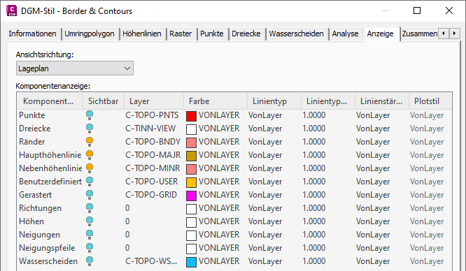 Im Dialogfeld DGM-Stil - Existing Ground Contours ist die Sichtbarkeit der Komponenten Rand, Haupthöhenlinie und Nebenhöhenlinie aktiviert. Diese Komponenten bestimmen, wie das DGM in der Zeichnung angezeigt wird. Bei Aktivierung der Komponenten wird das DGM wie in Abbildung 6 dargestellt.