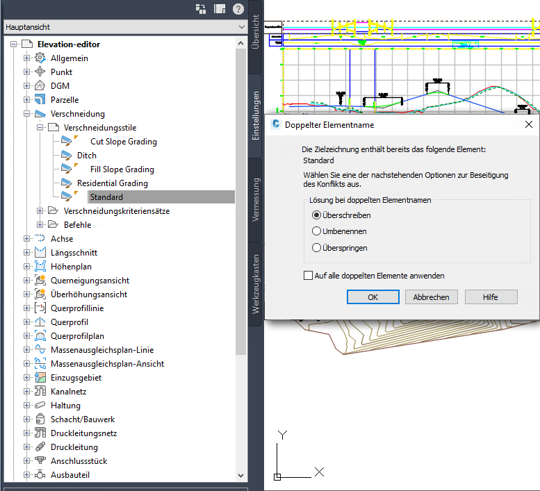 In dem nachfolgenden Beispiel in Abbildung 9 wurde in der Datei Sample_styles.dwg der Stil Grading Standard ausgewählt und auf den Namen der Datei Breaklines.dwg gezogen.