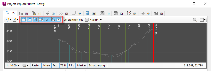 Der vertikale Überhöhungswert sowie die Einstellungen zum Ein-/Ausblenden für die einzelnen visuellen Komponenten eines bestimmten Höhen- oder Querprofilplans können auch über die zugehörigen Ansichtssteuerelemente im Project Explorer-Hauptfenster gesteuert werden, wie unten angegeben.