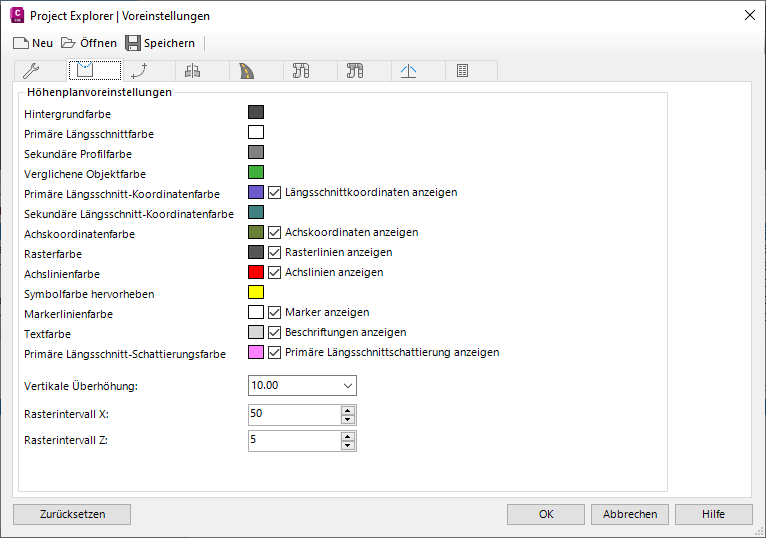 Über die übrigen fünf Registerkarten im Fenster Voreinstellungen in Project Explorer steuern Sie die Farb-, Stil-, Raster- und Skalierungseinstellungen der verschiedenen Höhen- und Querprofilpläne im Project Explorer-Hauptfenster.