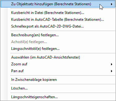 Um einen neuen Objektsatz zu erstellen, mit dem eine DWG-2D-Datei erstellt wird, wählen Sie eines oder mehrere Objekte aus einem beliebigen Objektlistenbereich im Project Explorer-Fenster und dann im Kontextmenü die Option Zu Objektsatz hinzufügen