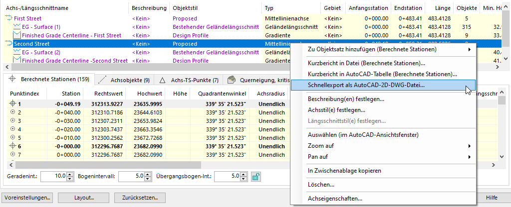 Um die Option Schnellexport als AutoCAD-2D-DWG-Datei zu verwenden, wählen Sie eines oder mehrere Objekte aus einem beliebigen Objektlistenbereich im Project Explorer-Fenster und dann im Kontextmenü die Option Schnellexport als AutoCAD-2D-DWG-Datei aus.