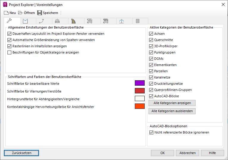Voreinstellungen bestimmen alle Aspekte der Benutzeroberfläche von Project Explorer, die für die Erstellung von Berichten nicht relevant ist. Beispiele: Farbschemata und Vorgabe-Maßstabseinstellungen für Höhen- und Querprofilpläne, Schriftarteinstellungen für die Benutzeroberfläche sowie Sichtbarkeit und Bereichslayout der einzelnen Objektkategorie-Registerkarten im Project Explorer-Fenster.