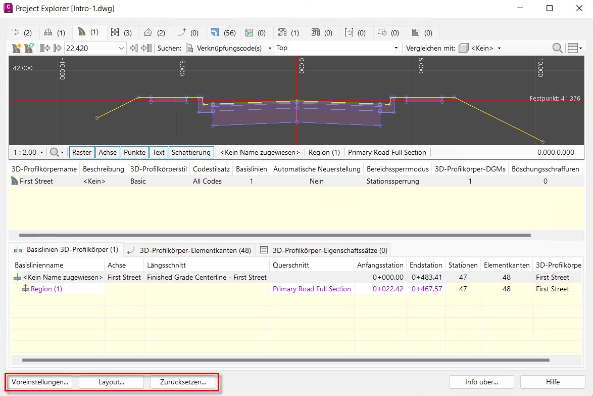 Voreinstellungen bestimmen alle Aspekte der Project Explorer-Benutzeroberfläche, die nicht für das Layout von Datenspalten und die Erstellung von Berichten relevant sind. Beispiele: Farbschemata und Vorgabe-Maßstabseinstellungen für Höhen- und Querprofilpläne, Schriftarteinstellungen für die Benutzeroberfläche sowie Sichtbarkeit und Bereichslayout der einzelnen Objektkategorie-Registerkarten im Project Explorer-Fenster.