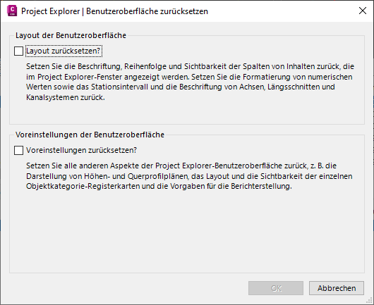 Die Layout-Optionen, die derzeit im Project Explorer-Fenster zugewiesen sind, können auf zwei Arten auf die Vorgabeeinstellungen zurückgesetzt werden: