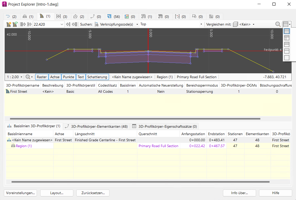 Optional können Sie das Achs-/Längsschnitt-Stationsintervall (Verkettung) für alle Objekttypen auf einen gemeinsamen Wert festlegen und sperren.