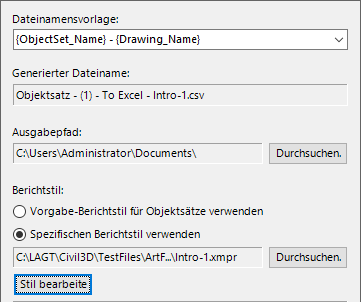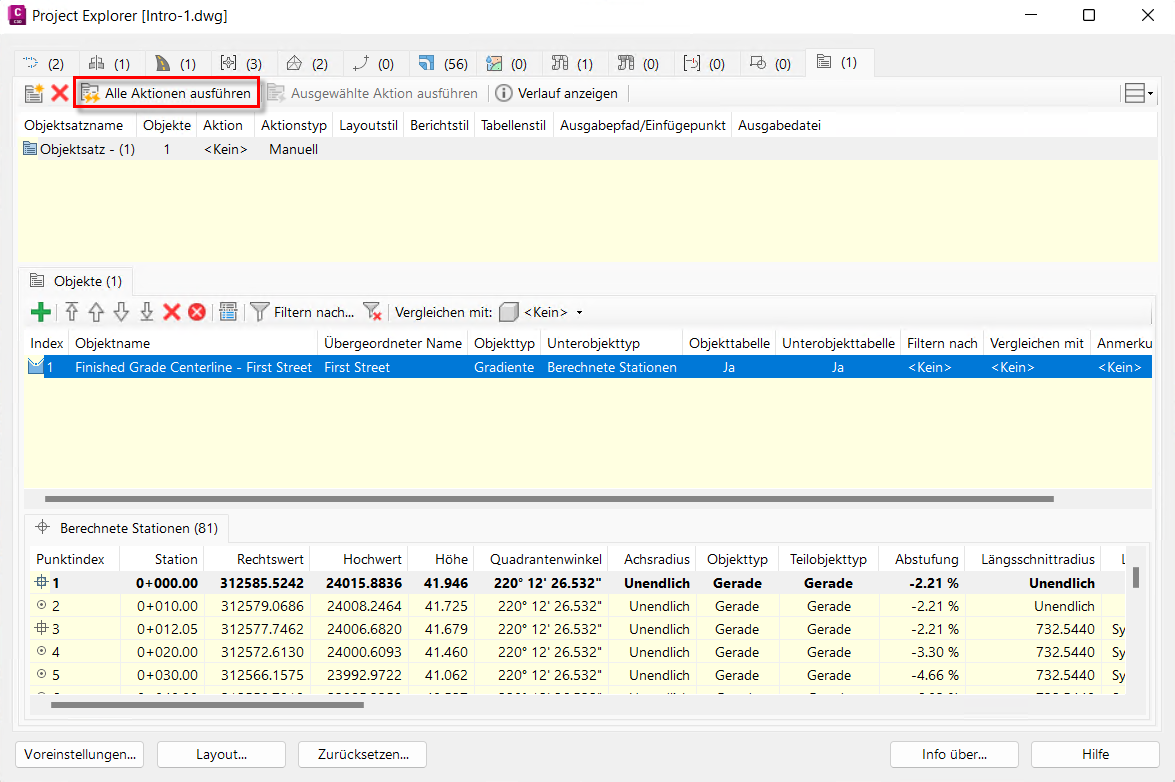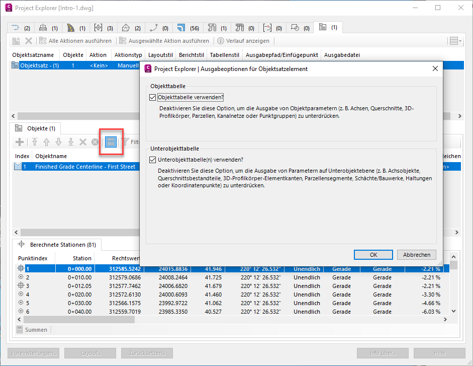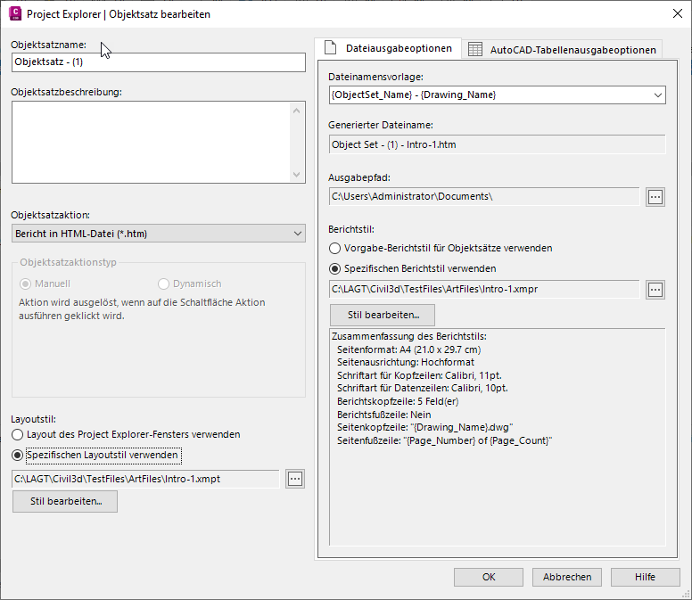 Ein Objektsatz ist eine vom Benutzer definierbare Liste von Civil 3D-Objekten, der Sie eine Aktion und andere zugehörige Details zuweisen können. Aktionen können manuell oder in einigen Fällen dynamisch ausgelöst werden, wenn Project Explorer feststellt, dass eine abhängige Komponente in Ihrem Entwurf geändert wurde. Objektsätze dienen in der Regel zur Automatisierung der Erstellung vorkonfigurierter Berichte, Tabellen, AutoCAD-Zeichnungen oder AutoCAD-Tabellen. Die genau erforderliche Kombination von Stilen, Filtern und Ausgabeanweisungen hängt vom Aktionstyp und Objekt ab, die zugewiesen werden.