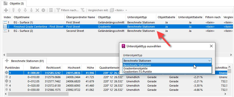 Für einige Civil 3D-Objekttypen gibt es mehrere verfügbare Unterobjekttypen für ein aufgelistetes Objektsatzelement. Für Achsen ist es beispielsweise möglich, einen Bericht zu erstellen, der berechnete Stationen, Achsobjekte, Achs-TS-Punkte oder kritische Querneigungsstationen enthält.