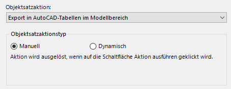 Optional kann jedem Objektsatz eine Objektsatzaktion zugeordnet werden. Aktionen werden in der Regel verwendet, um die Erstellung von Berichten, Arbeitsblättern oder AutoCAD-Tabellen zu automatisieren. Der Parameter Objektsatzaktionstyp bestimmt, wie die zugewiesene Aktion ausgelöst werden soll - entweder manuell oder dynamisch.