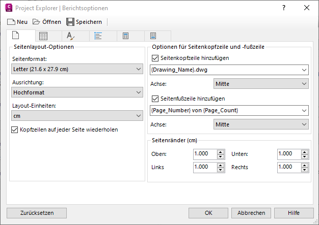 Berichtsoptionen bestimmen die Einstellungen für Seitenformat, Seitenausrichtung, Seitenränder, Berichtkopfzeile sowie Seitenkopf- und -fußzeilen für alle Berichte und Tabellen, die in Project Explorer erstellt wurden.