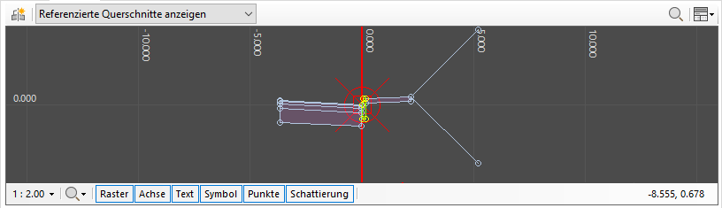 Die Querschnittsansicht auf der Registerkarte Querschnitte zeigt einen dynamischen Schnitt durch alle Querschnittsbestandteile an, die dem aktuell ausgewählten Querschnitt zugeordnet sind. Alle in der Liste der Querschnittsbestandteile ausgewählten Querschnittsbestandteile werden im Ansichtsbereich markiert, damit sie leichter erkannt werden. Änderungen an Parametern in allen angezeigten Querschnittsbestandteilen werden sofort in der Querschnittsansicht dargestellt.