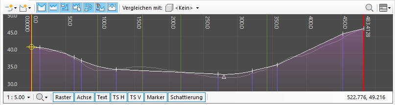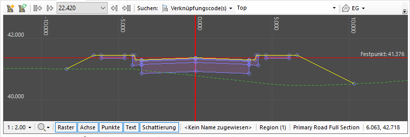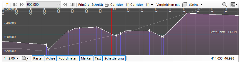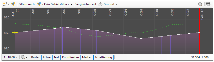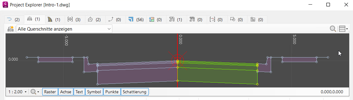Um in einem Höhen- oder Querprofilplan zu zoomen, drehen Sie das Mausrad. Wenn Sie die STRG-Taste gedrückt halten, während Sie das Mausrad bewegen, erhöht sich die Zoomgeschwindigkeit. Wenn Sie die ALT-Taste gedrückt halten und mit der Maus klicken, während Sie das Mausrad bewegen, verringert sich die Zoomgeschwindigkeit.