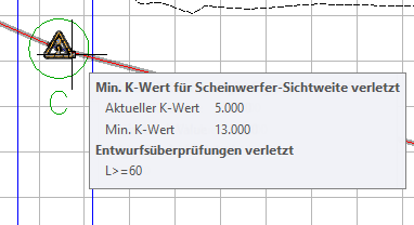 Wenn ein Längsschnitt-Teilobjekt gegen ein Kriterium oder eine Entwurfsüberprüfung verstößt, wird im Zeichnungsfenster, in der Ansicht Längsschnittobjekte und im Dialogfeld Entwurfsparameter (Längsschnitt) ein Warnsymbol für das Teilobjekt angezeigt. Wenn Sie mit der Maus auf das Warnsymbol zeigen, wird eine QuickInfo mit Informationen zu dem Verstoß eingeblendet. Falls gegen ein Entwurfskriterium verstoßen wurde, finden Sie in der QuickInfo das betreffende Kriterium und den Mindestwert, der erfüllt werden muss. Falls gegen eine Entwurfsüberprüfung verstoßen wurde, enthält die QuickInfo den Namen der betreffenden Entwurfsüberprüfung.