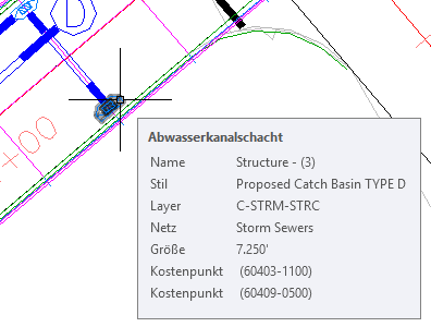 In der QuickInfo werden eine Beschreibung des Kostenpunkts und die ID angezeigt, die diesem Schacht/Bauwerk zugewiesen wurde.