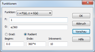 Verwenden Sie die Funktion r = F(a), z = G(a) für Polarfunktionen mit einer Z-Koordinate, die als Funktion des Winkels definiert ist.