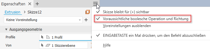 Boolesche Ausgabeoptionen werden in der Voreinstellung für Extrusion, Drehung, Sweeping und Spirale gespeichert. Bei Extrusion und Drehung weist die erweiterte Einstellung Voraussichtliche boolesche Operation und Richtung die Software an, die boolesche Auswahl basierend auf dem Profil und den Volumenkörpern im Modell vorzuschlagen. Die Einstellung überschreibt die voreingestellte Boolesche Auswahl.